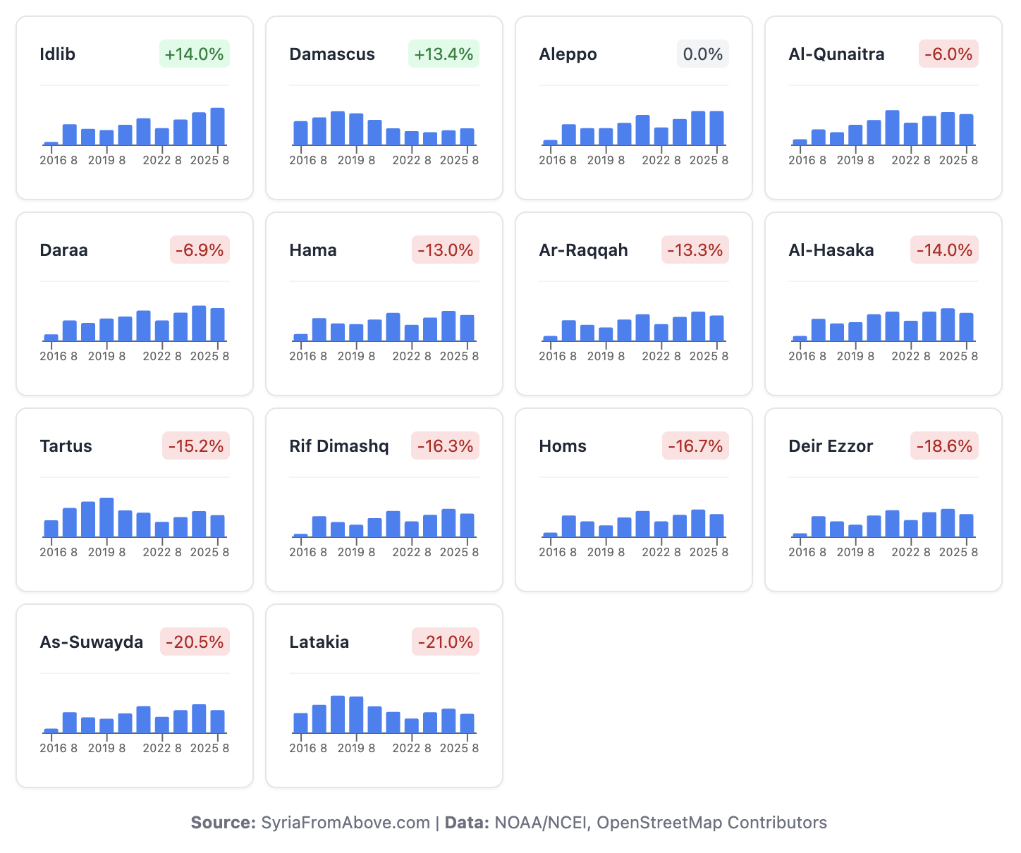 Pockets of Growth: Idlib (+14.0%) and the capital, Damascus (+13.4%), were the only governorates to record a year-over-year increase in median nighttime light levels in August 2025.